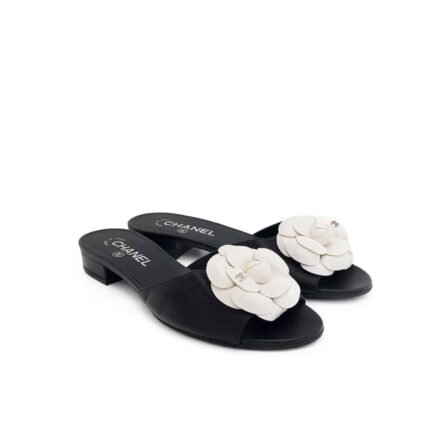 CHANEL WHITE CAMELLIA SLIDES BLACK