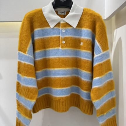 CELINE POLO SWEATER IN BRUSHED STRIPED COTTON OCHRE AND LIGHT BLUE RY0FQ0ZQJ GBO7