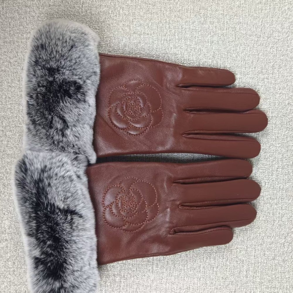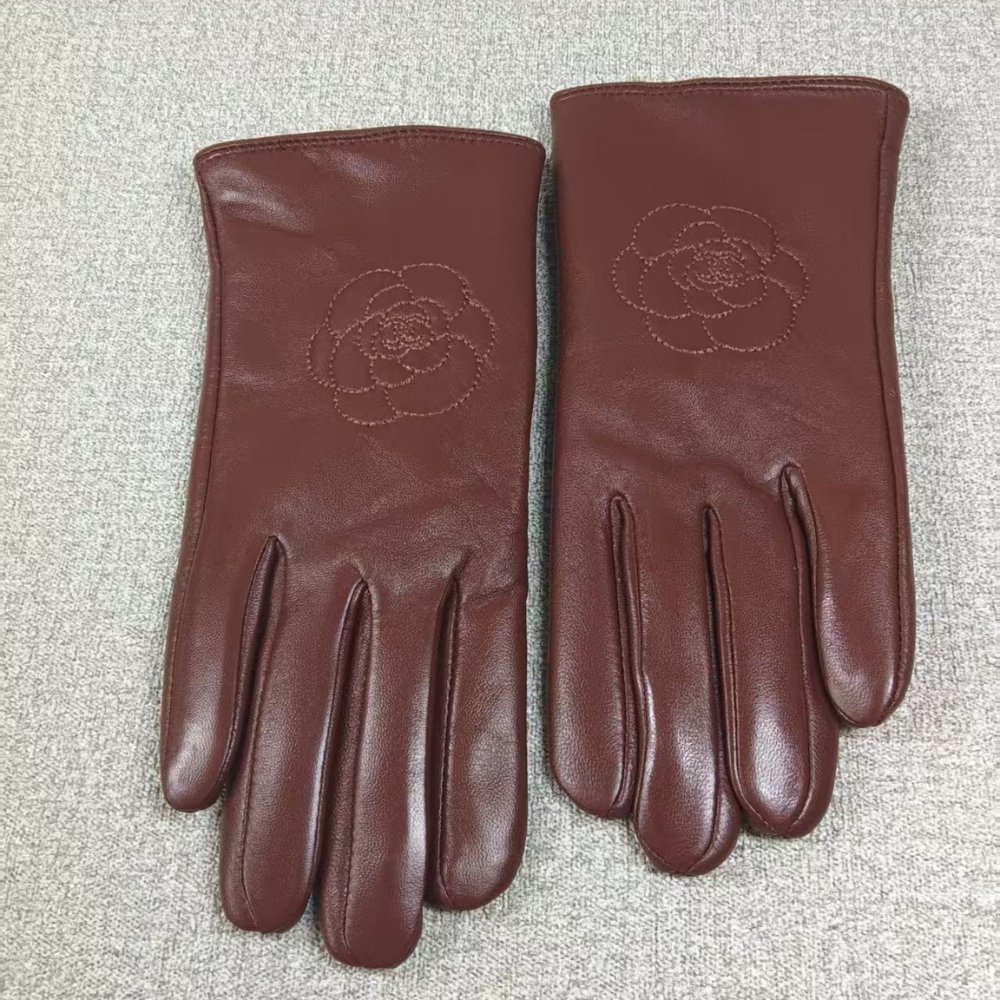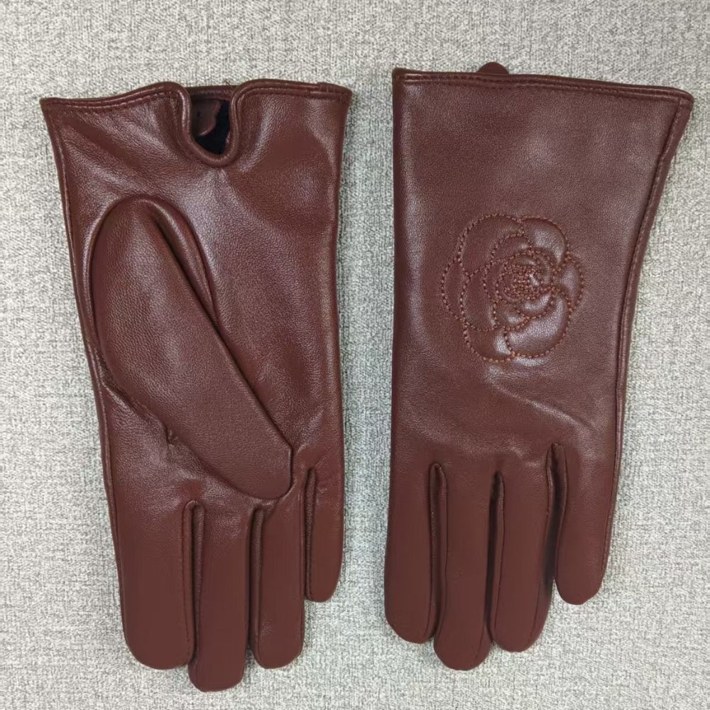 CHANEL LEATHER GLOVES WITH CAMELLIA FLOWER BROWN