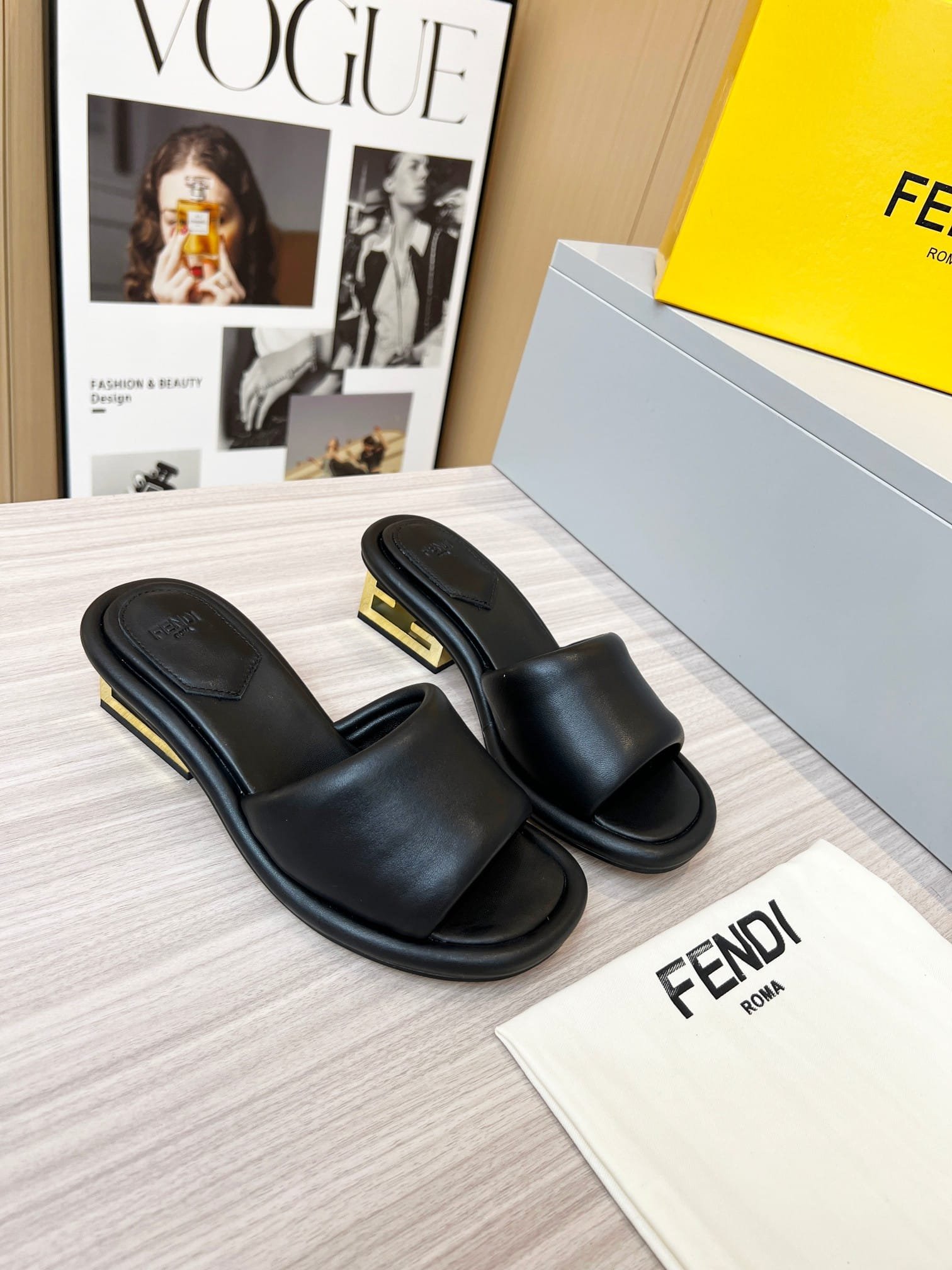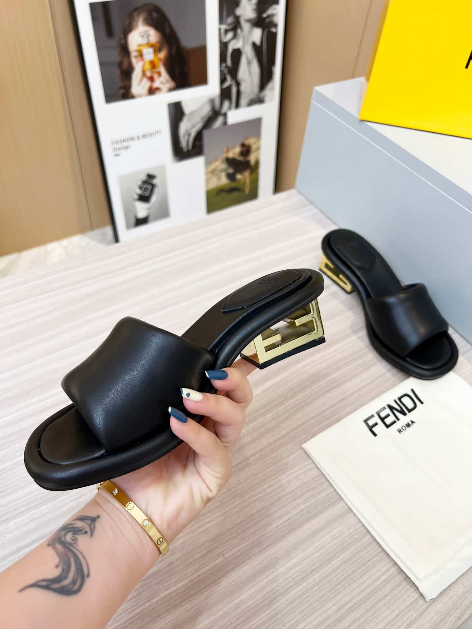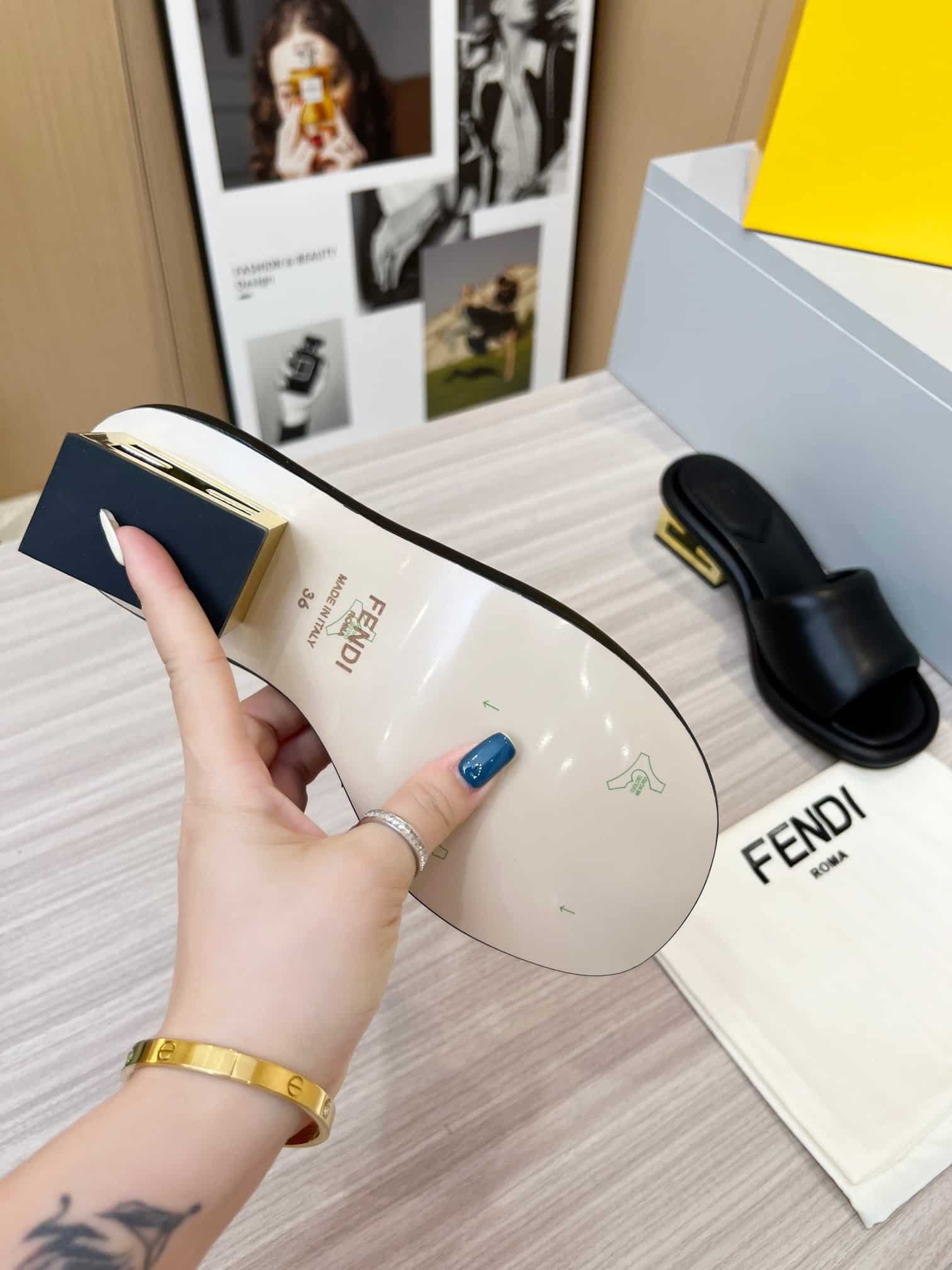 Be the first to review “FENDI CUTOUT METAL BLOCK HEEL PADDED LEATHER SANDALS BLACK” Cancel reply