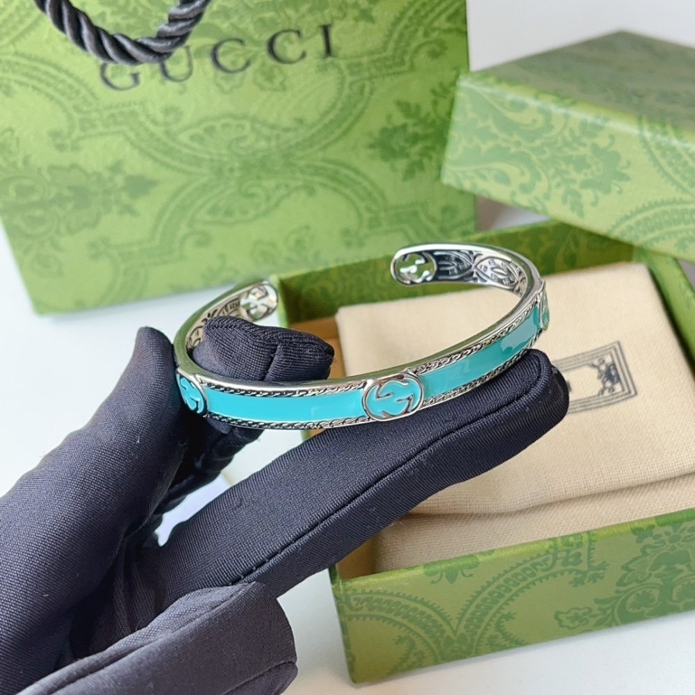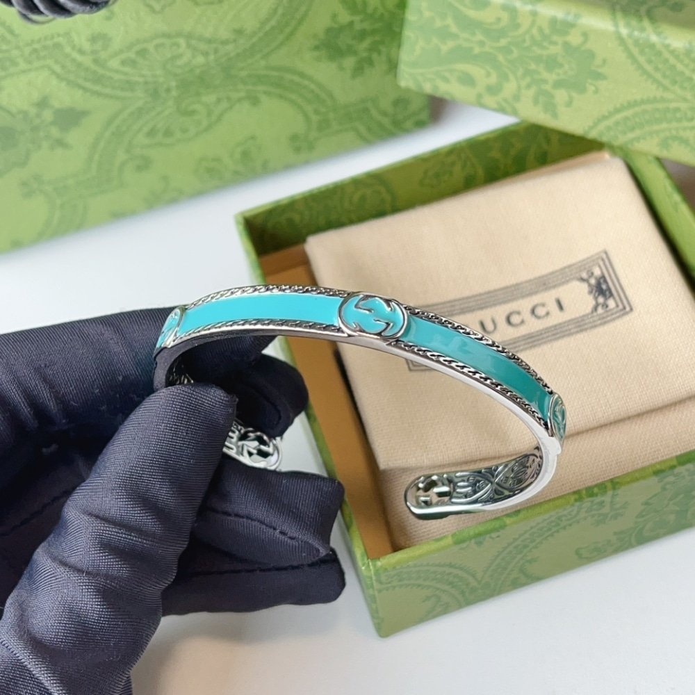 GUCCI CUFF BRACELET INTERLOCKING GG STERLING SILVER TURQUOISE ENAMEL