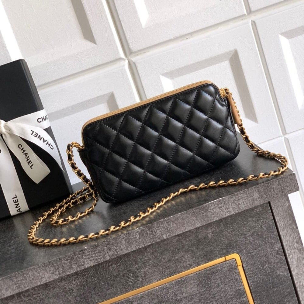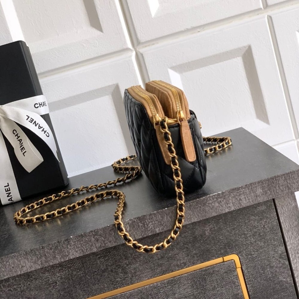 [SUPER VIP 1:1] – CHANEL ZIPPED PHONE HOLDER WITH CHAIN SHINY AND GOLD TONE METAL BLACK BEIGE 18CM AP4743 B20685 U1546